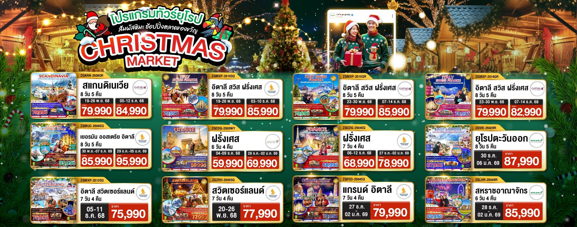 ****เดินทาง : 14-22 พฤศจิกายน 2569****มิลาน – ดูโอโม่ – เมสเตร้ – เกาะเวนิส– ล่องเรือกอนโดล่า - เมสเตร้ – ฮัลล์สตัทท์ - เคมเทน อินน์สบรุกซ์ – หลังคาทองคำ – ปราสาทนอยชวานสไตน์ – อนุสาวรีย์สิงโต – เลาเทอร์บรุนเนน – น้ำตกชเตาบ์บาค – นั่งรถไฟพิชิตยอดเขาจุงเฟรา - ซุก– กรุงวาดุส – ลูเซิร์น – V-Cableway – อินเทอร์ลาเก้น – ซูริค ฯลฯ