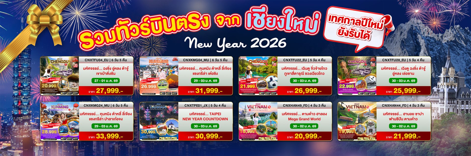 ****เดินทาง: 30 ธ.ค. 2568 – 03 ม.ค. 2569 ;01 – 05 มกราคม 2569 **** เมืองเถาหยวน – ร้านขนมพายสับปะรด – อุทยานแห่งชาติเหย่หลิ่ว – บูราโน่แห่งไต้หวัน – หมู่บ้านโบราณจิ่วเฟิ่น – เมืองผิงซี – ถนนโบราณสือเฟิ่น ฯลฯ