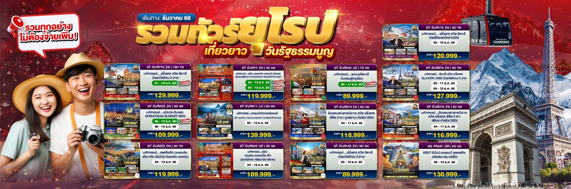 ****เดินทาง : 09-16 เมษายน 2569****โรม - นครรัฐวาติกัน- โคลอสเซียม - น้ำพุเทรวี่ - มอนเตคาตินี่ - ปิซ่า - เมสเตร่ - เกาะเวนิส - อินเตอร์ลาเค่น -ดิจอง - ปารีส-หมู่บ้านเลาเทอร์บรุนเน่น - นั่งรถไฟพิชิตยอดเขาจุงเฟรา - เข้าชมพระราชวังแวร์ซายย์ - ล่องเรือชมแม่น้ำแซนน์ ฯลฯ