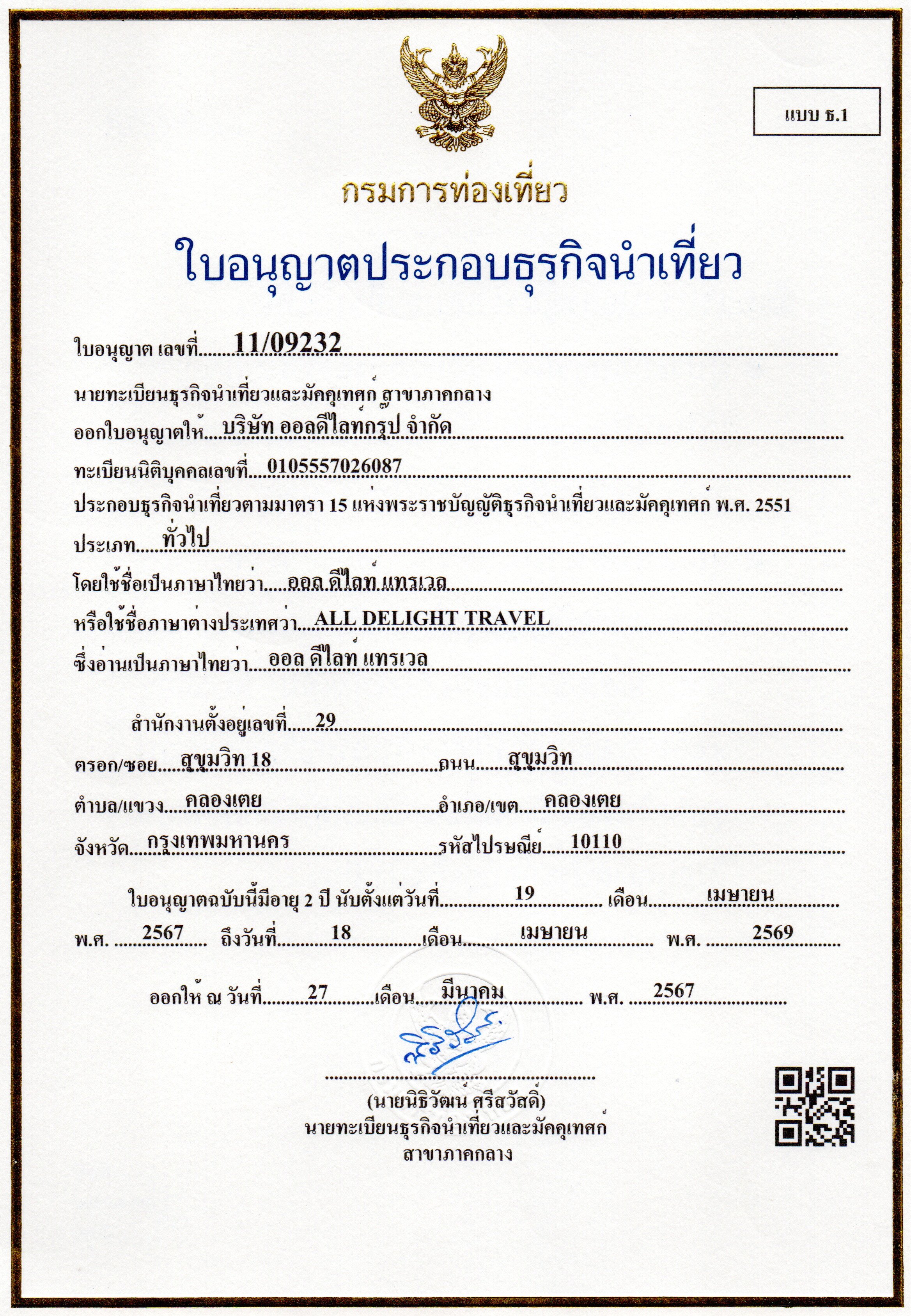All Delight Travel จดทะเบียนในนาม บริษัท ออลดีไลท์กรุ๊ป จำกัด ก่อตั้งอย่างถูกต้องตามกฎหมาย เมื่อวันที่ 20 กุมภาพันธ์ พ.ศ. 2557 ทะเบียนนิติบุคคลเลขที่ 0105557026087 และได้รับ ใบอนุญาตประกอบธุรกิจนำเที่ยวเลขที่ 11/09232 ซึ่งเป็นหลักประกันถึงความถูกต้อง โปร่งใส และความมั่นคงทางธุรกิจ