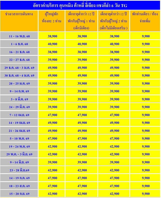 อัตราค่าบริการ ทัวร์คุนหมิง - ต้าหลี่ - ลี่เจียง - แชงกีล่า 6D 5N -TG