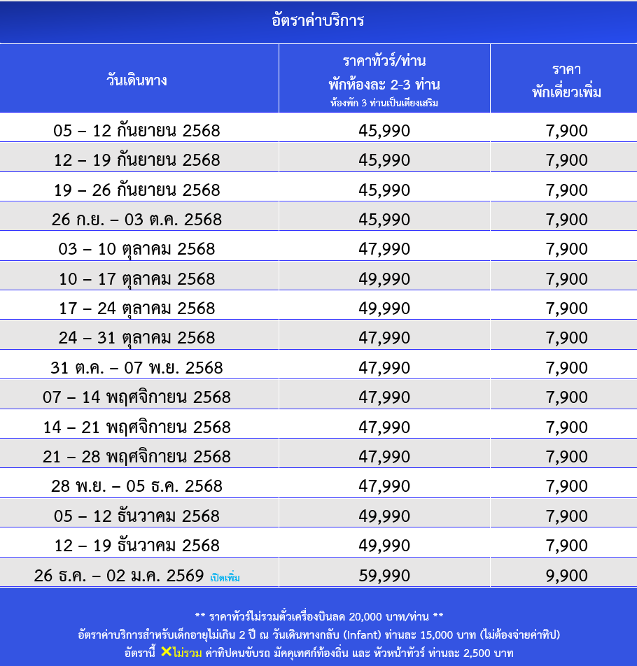 กำหนดวันเดินทาง : กันยายน - ธันวาคม 2568 (ช่วงปีใหม่)