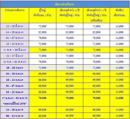 กำหนดวันเดินทาง :  มึนาคม 2569 - กุมภาพันธ์ 2570