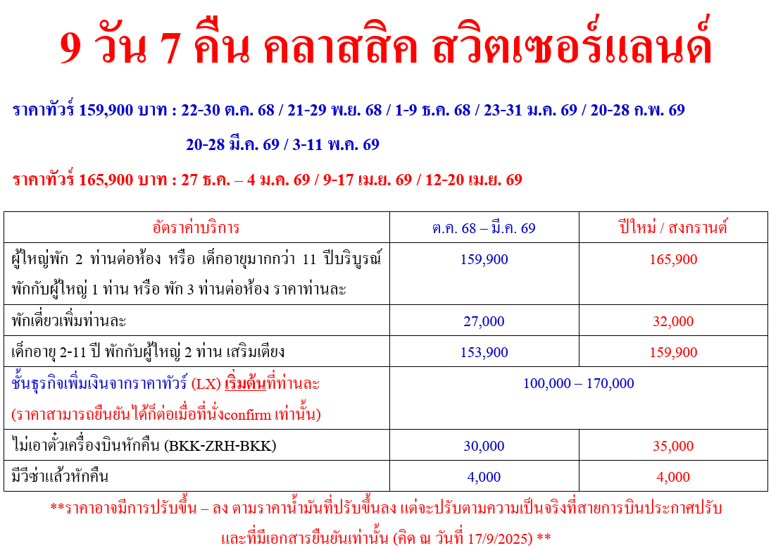 อัตราค่าบริการ 9 วัน 7 คืน คลาสสิค สวิตเซอร์แลนด์-LX