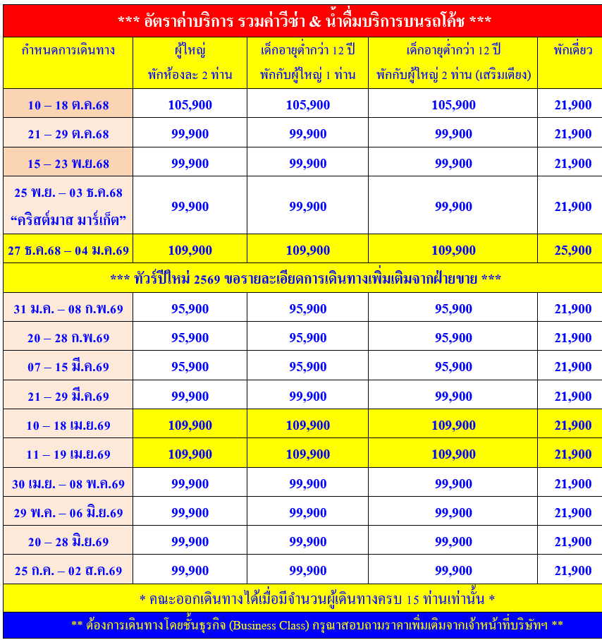 กำหนดวันเดินทาง :  กรกฎาคม 2568 - มีนาคม 2569