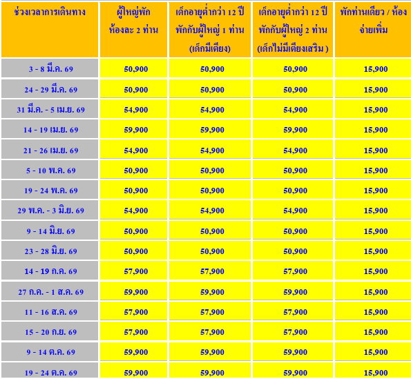 กำหนดวันเดินทาง :  มีนาคม - พฤศจิกายน 2569