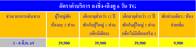 อัตราค่าบริการ ทัวร์จีนเฉิงตู - ฉงชิ่ง - ต้าจู๋ - อู่หลง 6D 5N -TG