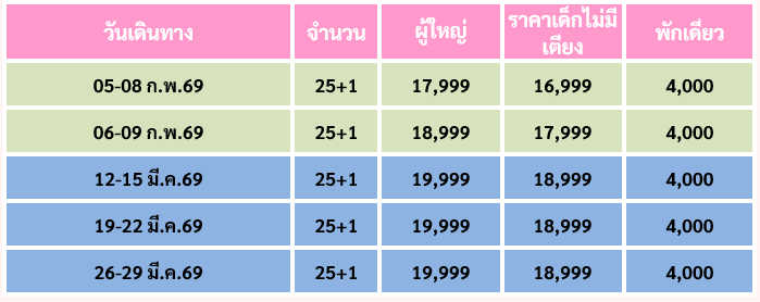 กำหนดวันเดินทาง : กุมภาพันธ์ 2569 - มีนาคม 2569