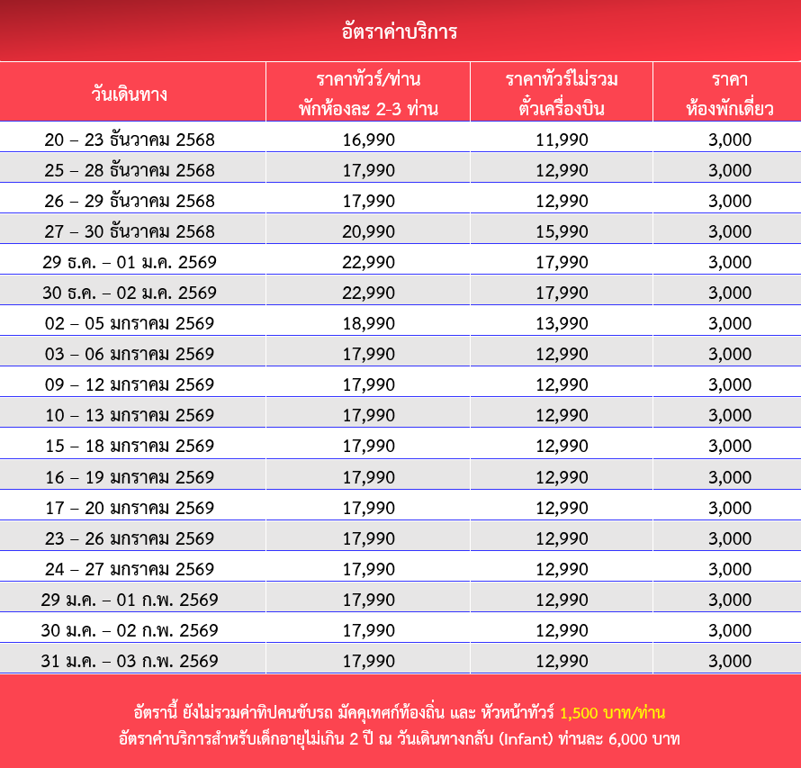 กำหนดวันเดินทาง :  ธันวาคม 2568 - มกราคม 2569