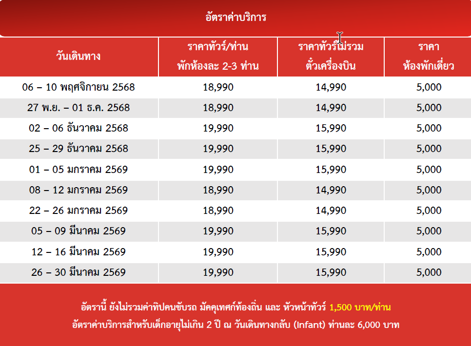 กำหนดวันเดินทาง : พฤศจิกายน 2568 - มีนาคม 2569