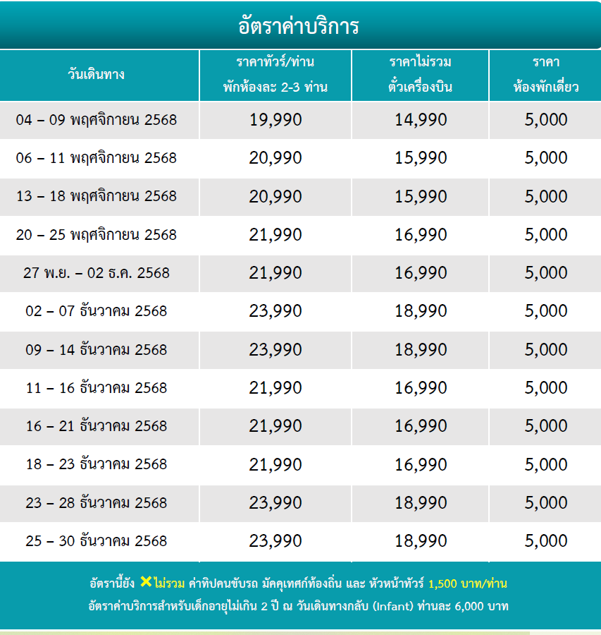 กำหนดวันเดินทาง :   พฤศจิกายน - ธันวาคม  2568