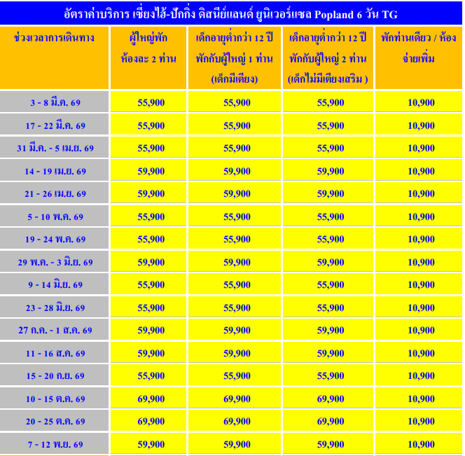 อัตราค่าบริการ ทัวร์เซี่ยงไฮ้ ปักกิ่ง Disneyland - Universal - Popland 6D 5N -TG