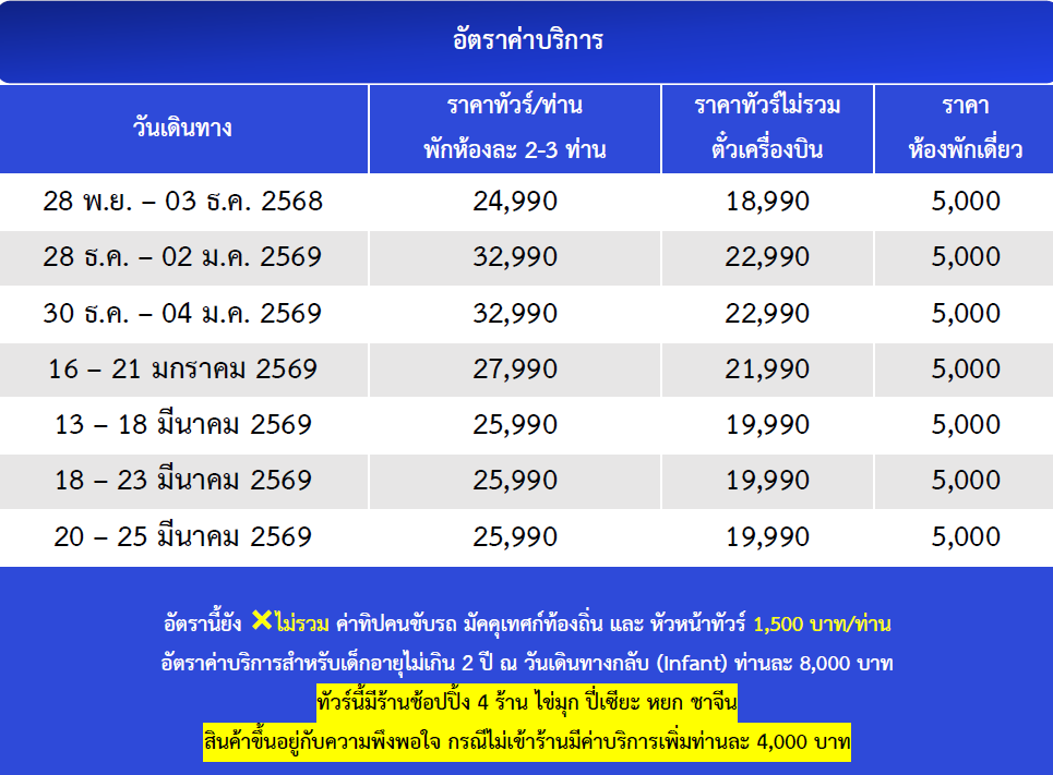 กำหนดวันเดินทาง :   พฤศจิกายน 2568 - มีนาคม 2569