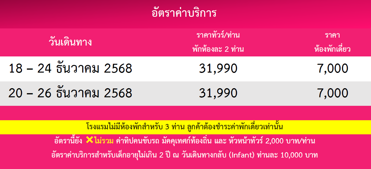 กำหนดวันเดินทาง : 18 – 24 ธันวาคม ; 20 – 26 ธันวาคม 2568