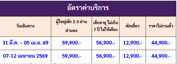 กำหนดวันเดินทาง : 31 มีนาคม 2569- 05เมษายน 2569/07-12 เมษายน 2569