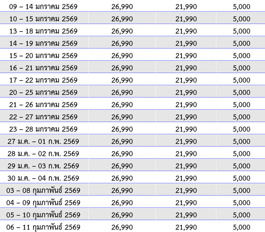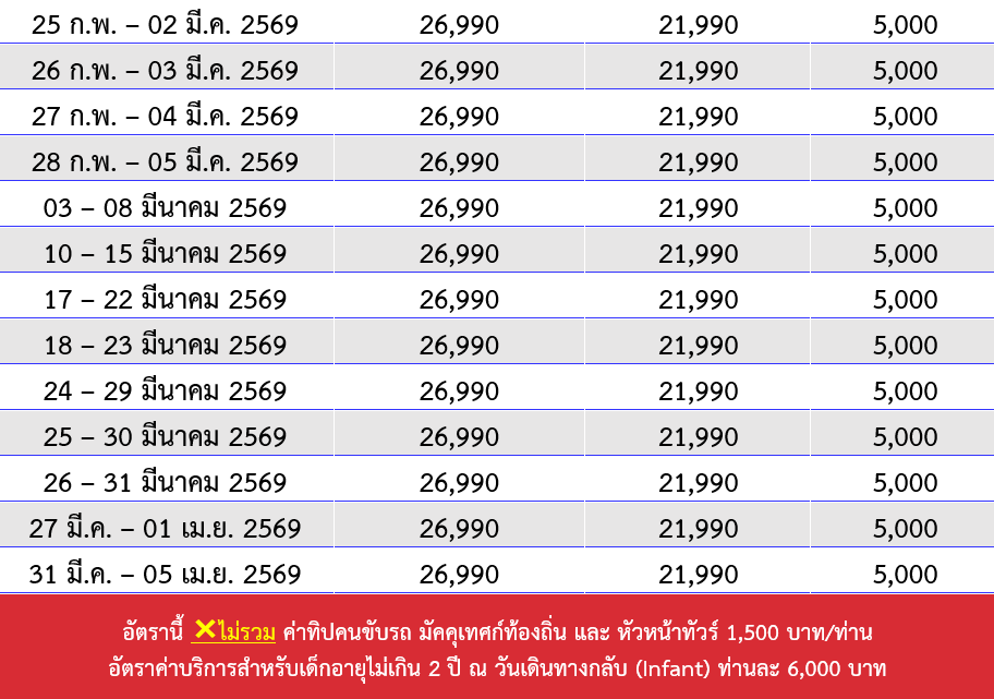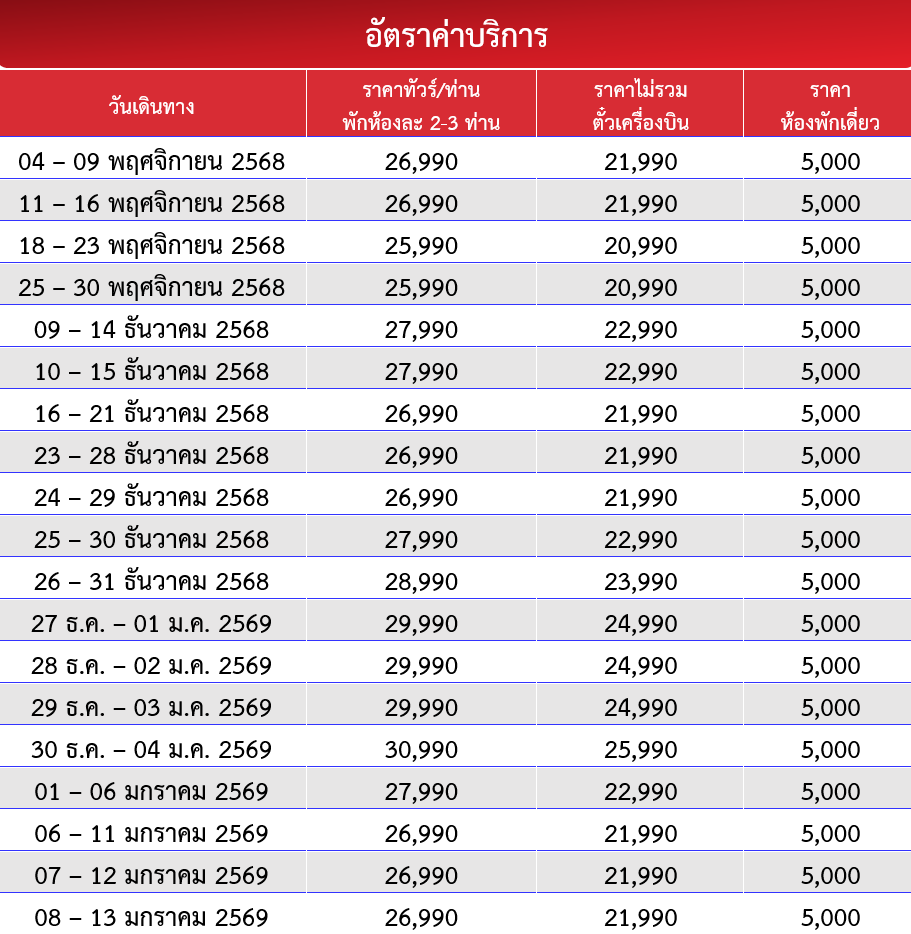 กำหนดวันเดินทาง :  พฤศจิกายน 2568 - มีนาคม 2569