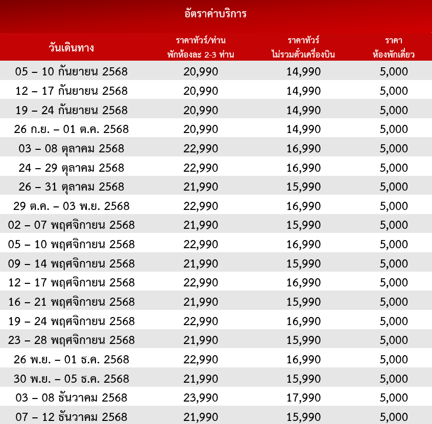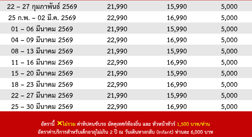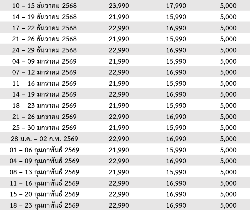 กำหนดวันเดินทาง : กันยายน 2568 - มีนาคม 2569