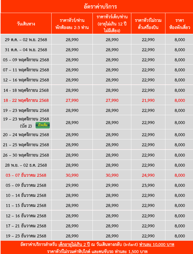 กำหนดวันเดินทาง : พฤศจิกายน - ธันวาคม 2568