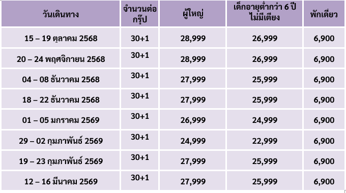กำหนดวันเดินทาง :  ตุลาคม 2568 - มีนาคม 2569