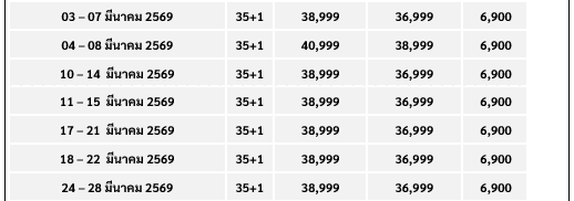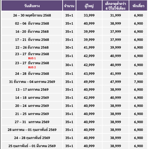 กำหนดวันเดินทาง :   พฤศจิกายน 2568 - มีนาคม 2569