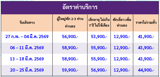 กำหนดวันเดินทาง :  กุมภาพันธ์ 2569 - มีนาคม 2569