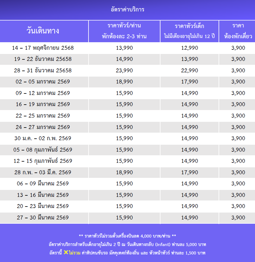 กำหนดวันเดินทาง :  พฤศจิกายน 2568 - มีนาคม  2569