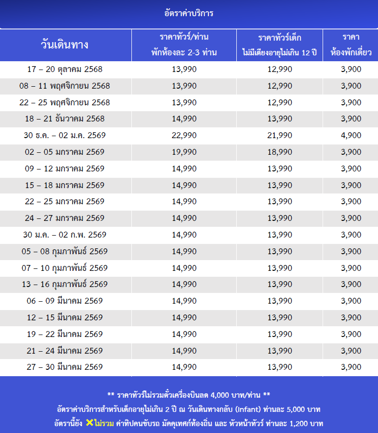 กำหนดวันเดินทาง :  ตุลาคม 2568 - มีนาคม  2569