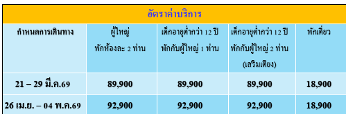 กำหนดวันเดินทาง :  มีนาคม 2569 - พฤษภาคม 2569