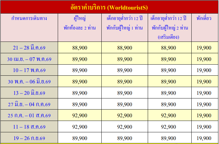 กำหนดวันเดินทาง :  มีนาคม 2569 - กันยายน 2569