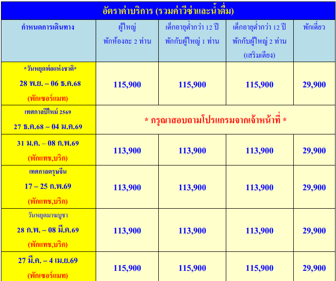 กำหนดวันเดินทาง :  พฤศจิกายน 2568 - เมษายน 2569