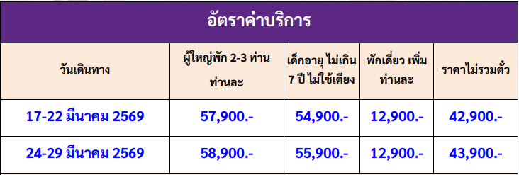 กำหนดวันเดินทาง : 17-22/24-29 มีนาคม 2569