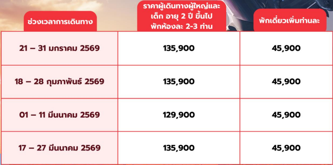 กำหนดวันเดินทาง :  มกราคม - มีนาคม  2569