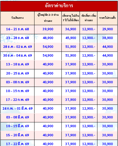 กำหนดวันเดินทาง :   ธันวาคม 2568-มีนาคม 2569