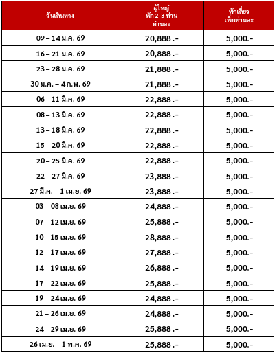 กำหนดวันเดินทาง :  มกราคม 2569 - เมษายน 2569