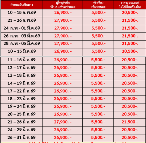 กำหนดวันเดินทาง :  กุมภาพันธ์ 2569 - มีนาคม 2569