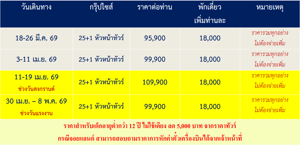 กำหนดวันเดินทาง :  มีนาคม - เมษายน 2569  (สงกรานต์ 2569)