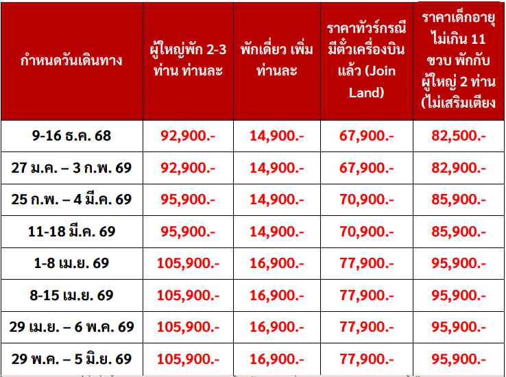 กำหนดวันเดินทาง : ธันวาคม 2568 - มิถุนายน 2569