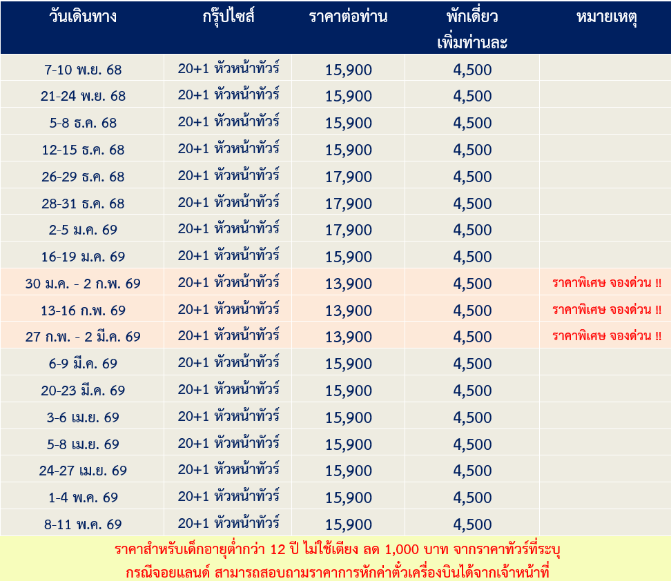 กำหนดวันเดินทาง : พฤศจิกายน 2568 - พฤษภาคม 2569