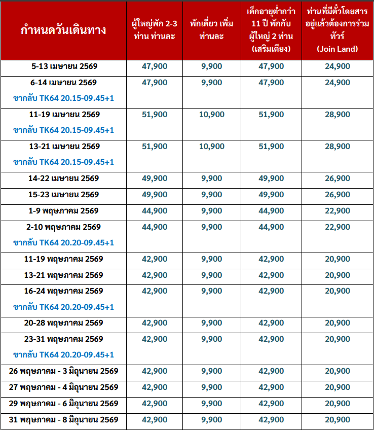 กำหนดวันเดินทาง :  เมษายน 2569 - มิถุนายน 2569