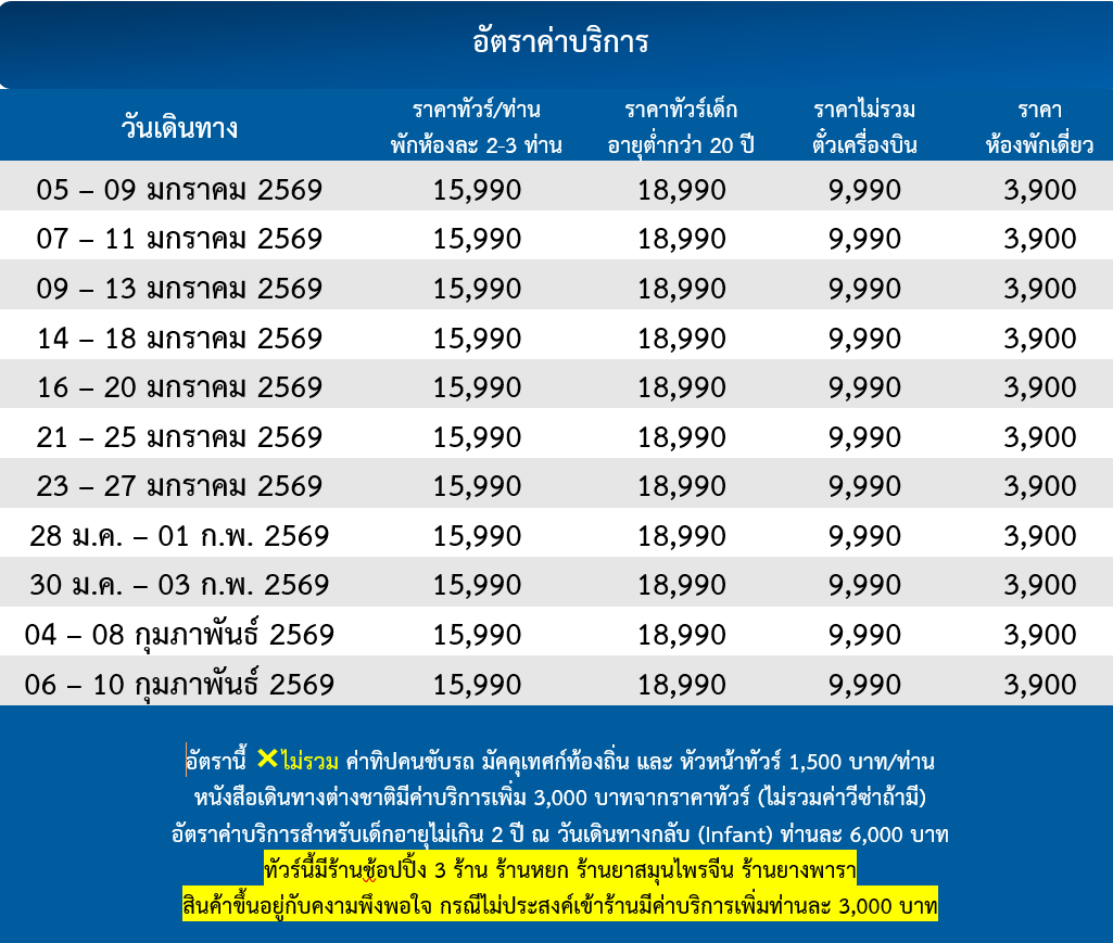 กำหนดวันเดินทาง : มกราคม - กุมภาพันธ์ 2569