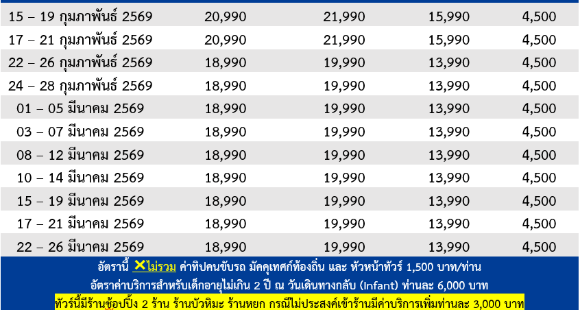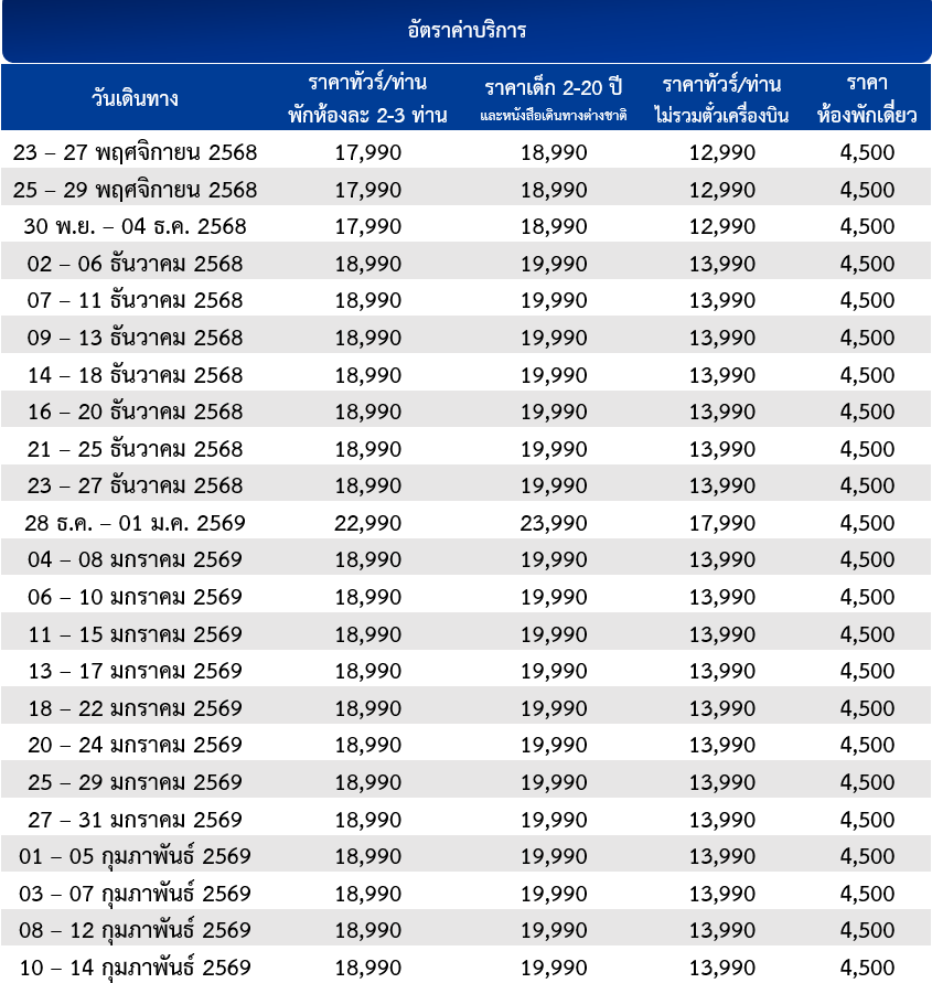 กำหนดวันเดินทาง :  พฤศจิกายน 2568  -  มีนาคม 2569