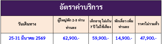 กำหนดวันเดินทาง :   25-31 มีนาคม 2569