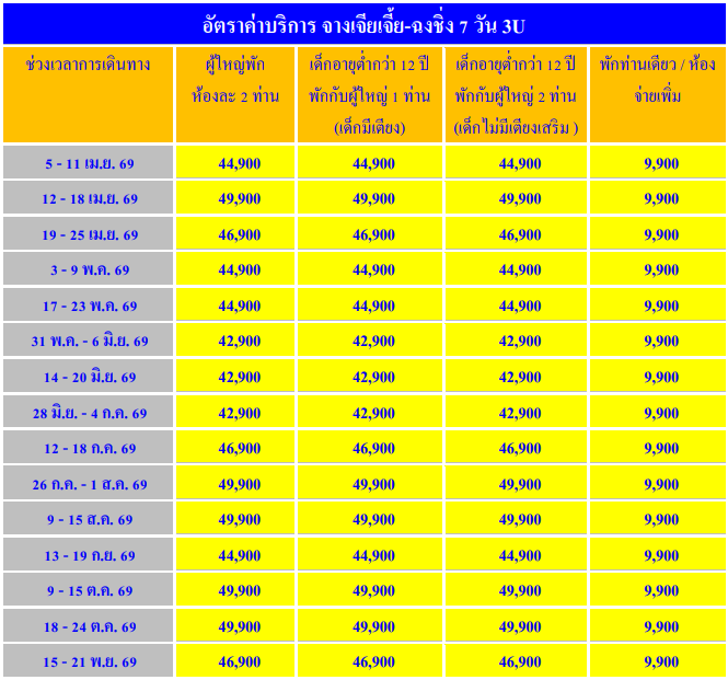 อัตราค่าบริการ ทัวร์จางเจียเจี้ย-ฉงชิ่ง-ฟูหรงเจิ้น-เฟิ่งหวง 7 วัน- 3U
