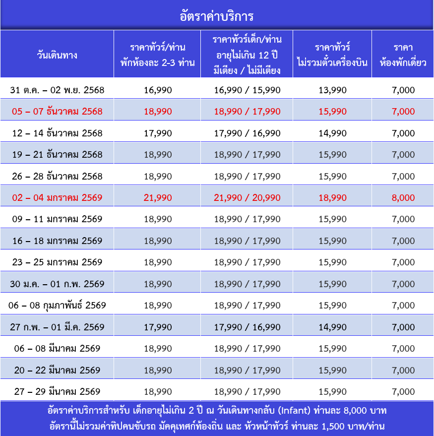 กำหนดวันเดินทาง : พฤศจิกายน 2568 - มีนาคม 2569