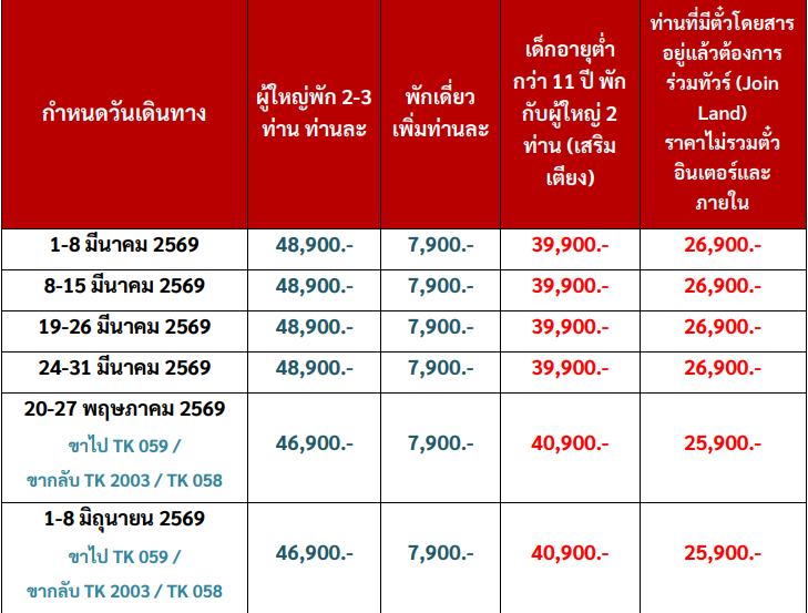กำหนดวันเดินทาง : มีนาคม - มิถุนายน 2569