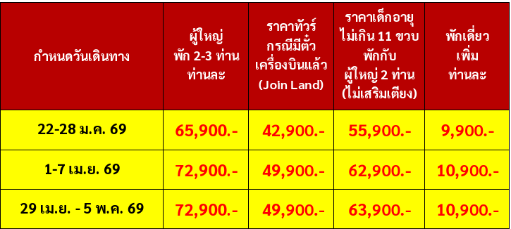 กำหนดวันเดินทาง :  มกราคม - พฤษภาคม 2569