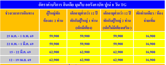 อัตราค่าบริการ  ทัวร์อินเดียมรดกโลก ถ้ำอชันต้า–ถ้ำเอลโลร่า–วิหารพระพิฆเนศ 8 วัน -TG