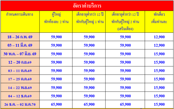 กำหนดวันเดินทาง : กุมภาพันธ์ - ธันวาคม 2569 (ปีใหม่ 2570)