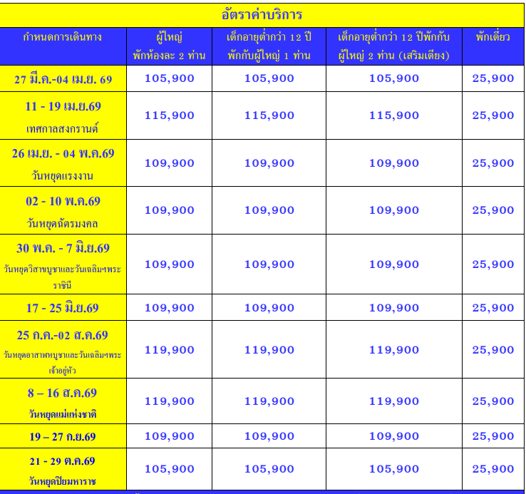 กำหนดวันเดินทาง : มีนาคม - ตุลาคม 2569