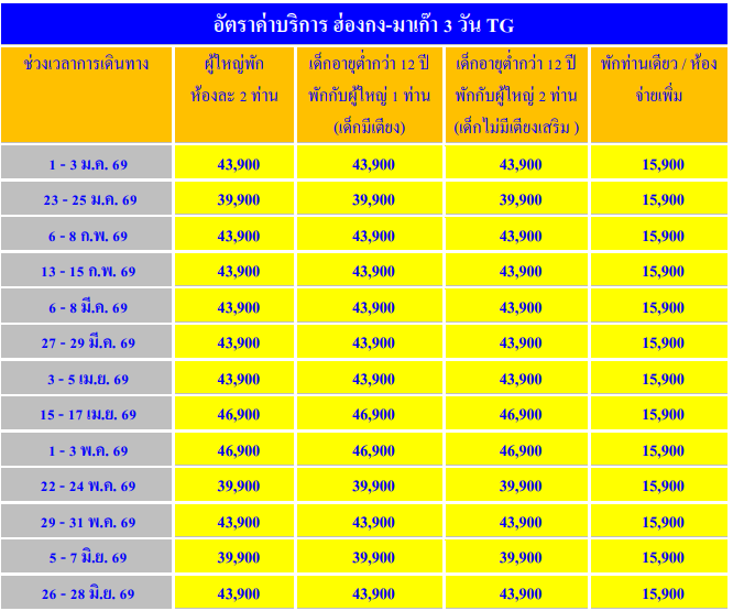 อัตราค่าบริการ ทัวร์ฮ่องกง - มาเก๊า 3 วัน 2 คืน-TG